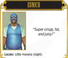 Eunich made his money by selling methamphetamine to the other gangs in Miami, and owned a red Mystery Machine van. In 2014, rival gang leader Ronnie Ligi hijacked his van and gunned him down in South Town with a Carbine Assault Rifle when he saw Eunich draw out his pistol.