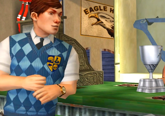 At the beginning of chapter 2, Gord invites Jimmy Hopkins to visit their Preps' WWE Gym in Old Bullworth Vale despite Jimmy not being so happy about it. Strangely, he has a different voice in this mission due to having some crumbs stuck in his throat.