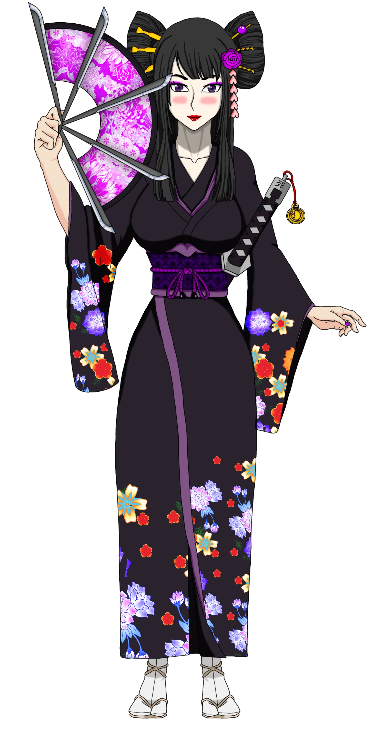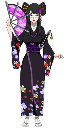 Miharu is a tall, slender, and beautiful woman with long black hair and purple eyes. She styled her fashion as a geisha with make-up, multiple head ornaments, and a black and purple kimono with floral pattern on it.